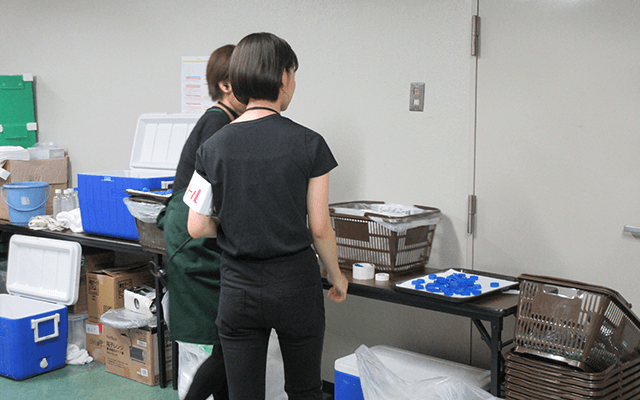 まずは、ケータリング準備のお手伝い。スタッフさんから指示をもらって、飲み物とおしぼりの準備をします。