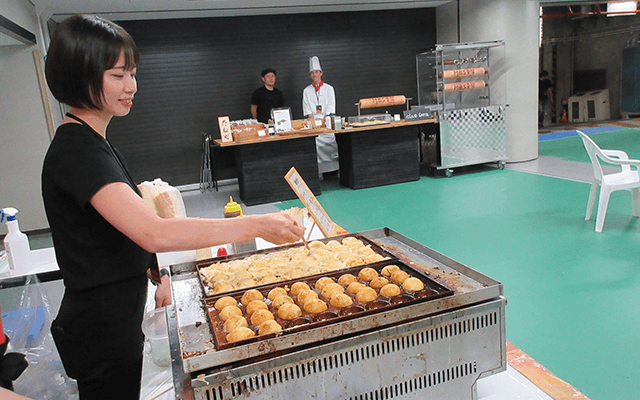 「どの味にしますか?」と、辻野さん。笑顔で、たこ焼きを手渡していました。