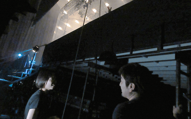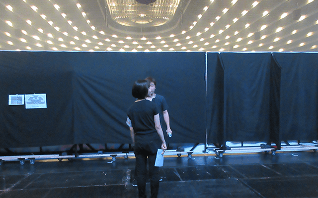 舞台裏を回り、場所を確認しながら慎重に掲示します。