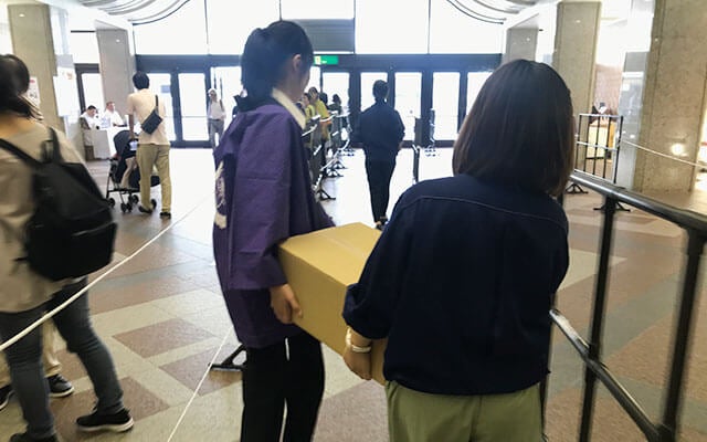 列に並ぶお客様ひとりひとりへハガキを配っていきます。
