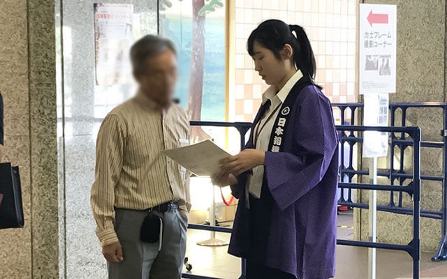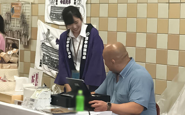 力士フレームで写真が撮れるブースとなっていて、並んだお客様や迷っているお客様にお声がけして「こんな風に写真が撮れますよ」とご説明していました。