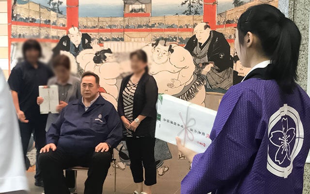 この日は敬老の日のイベントも行っており、芝田山親方との写真撮影に参加された方にお土産を渡していきます
