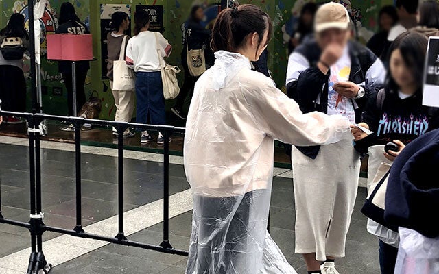 会場敷地内に設置された特設参加型ブースにて、体験をして頂いた方にチラシを手渡ししていきます。あいにくの小雨でしたが、カッパをきて渡していきます。