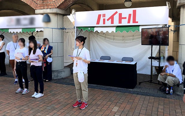 まずは、会場内に設営されたバイトル特設ブースにて、バイトルキャンペーンのチラシを来場者へ配っていきます。