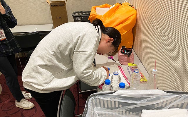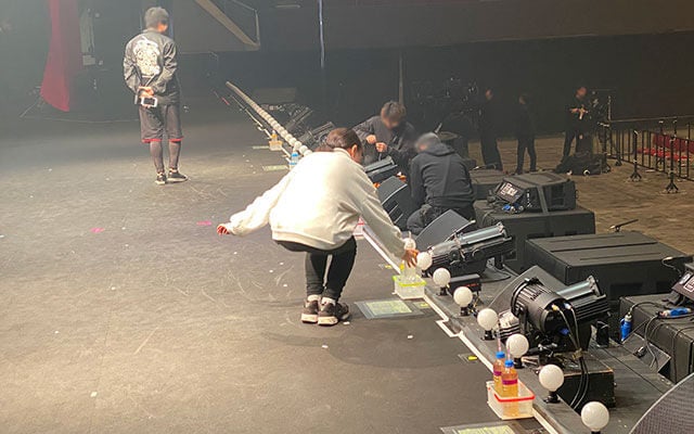 最後にステージ上に登って、コンサート中にメンバーが飲むお水を配置していきます。