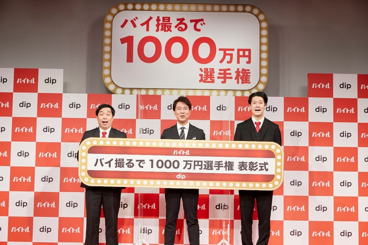 ディップ株式会社(本社:東京都港区、代表取締役社長 兼CEO:冨田英揮、以下当社)は、動画投稿キャンペーン「バイ撮るで1000万円選手権」表彰式を7月3日(土)に開催しました。最高賞金1000万円のグランプリは働く人々のキャラクターが伝わるストーリー性のある動画を投稿した「学童保育 Anchor」に決定。表彰式には、「バイ撮るで1000万円選手権」の審査員を務め、TVCMにも出演している人気お笑い芸人・霜降り明星の粗品さん、せいやさんのお二人にゲストとして参加いただきました。