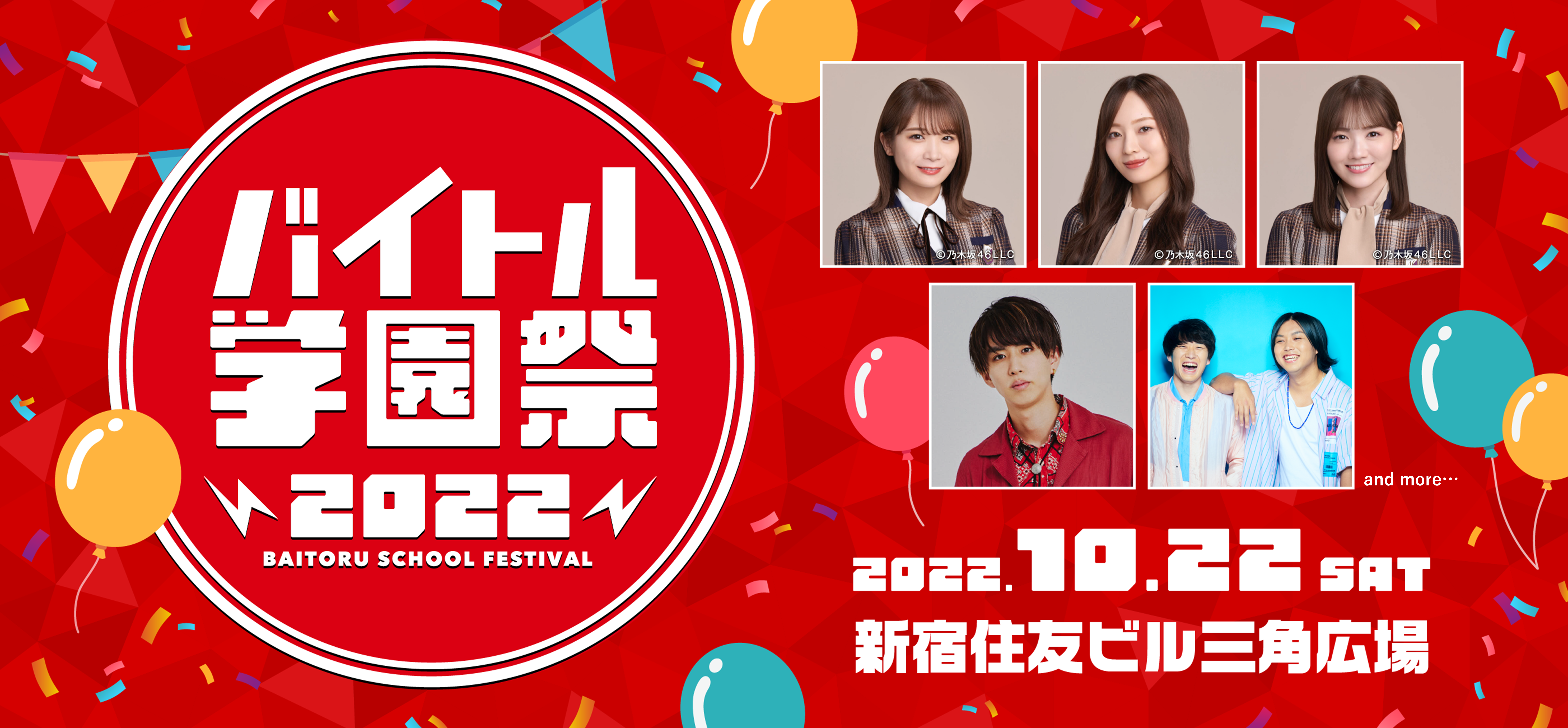 ディップ株式会社(以下、「当社」)は、アルバイト・パート求人情報サイト「バイトル」の20周年を記念して、「乃木坂46」の秋元真夏さん、梅澤美波さん、田村真佑さんや、人気動画クリエイターのはじめしゃちょーさん、水溜りボンドさんを始めとする豪華メンバーが登場する「バイトル学園祭2022」を、2022年10月22日(土)に新宿区西新宿の新宿住友ビル三角広場で開催し、810名を無料でご招待します。本日、9月26日(月)より募集開始します。