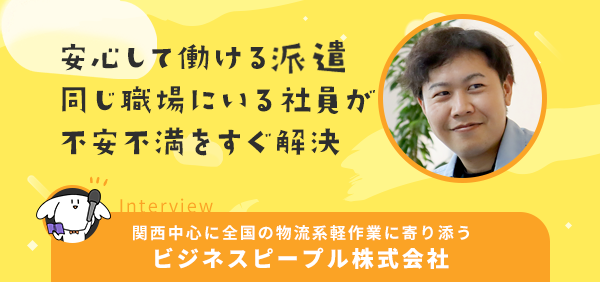 物流系軽作業を中心に派遣のお仕事を紹介している、ビジネスピープル株式会社。現場監督や派遣スタッフのマネジメントを行う勝山さんと、採用や派遣先とのやりとりを行う太田さんの2名の社員にお話を伺いました。そこから見えてきたのは、「安定できる派遣」を体現する、ビジネスピープルの姿でした。