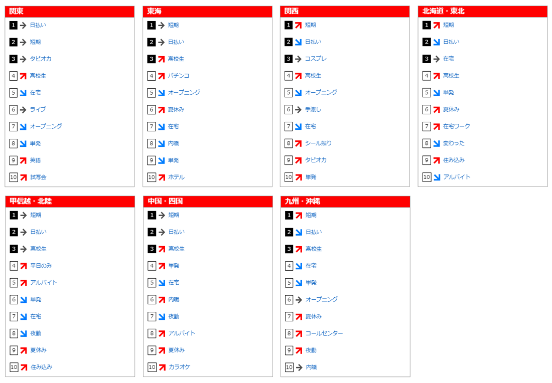 『バイトル人気バイトフリーワードランキング』は、「バイトル」内で検索されたキーワードを集計したものです。関東、東海、関西、北海道・東北、甲信越・北陸、中国・四国、九州・沖縄の全7版、「バイトル」にて展開しているエリア別のランキングがご覧いただけます。
