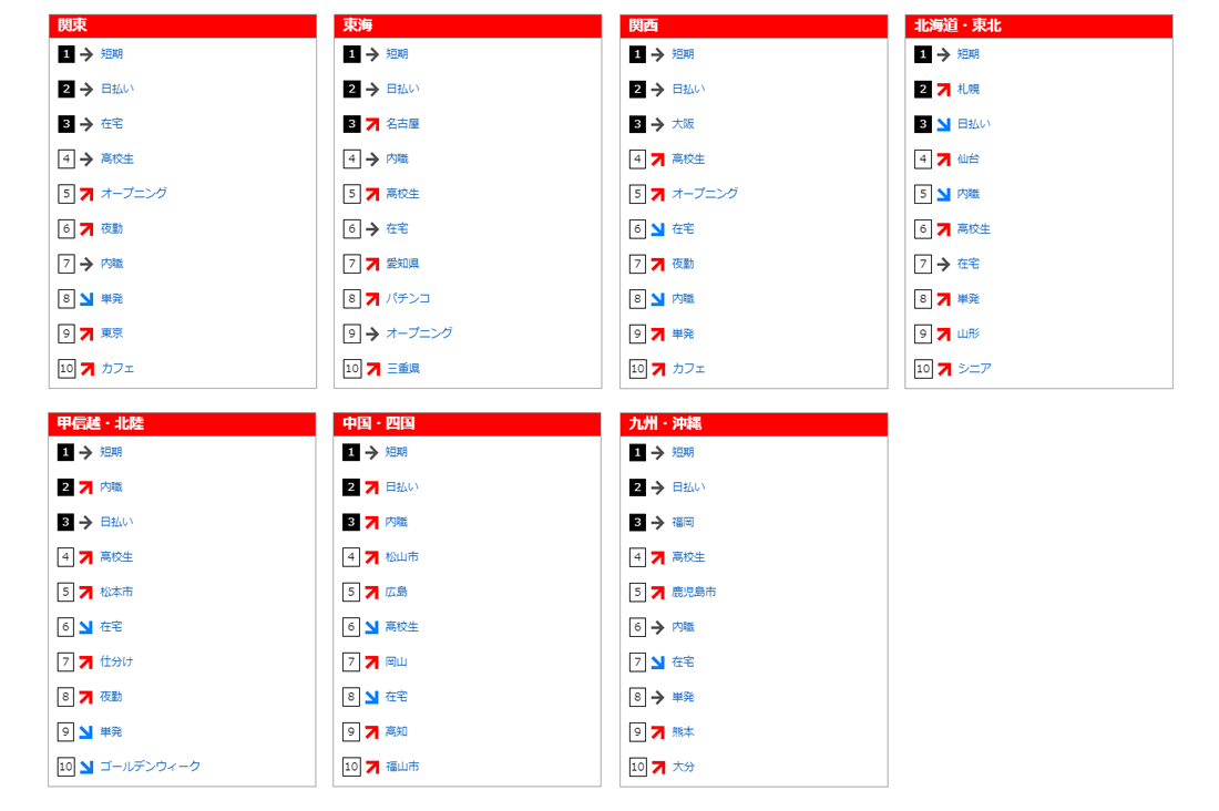 「関東」「東海」「関西」「北海道・東北」「甲信越・北陸」「中国・四国」「九州・沖縄」の全7エリアで、前月に続き「短期」が1位を獲得しました。「短期」のアルバイトを探すユーザーの動きがみられました。