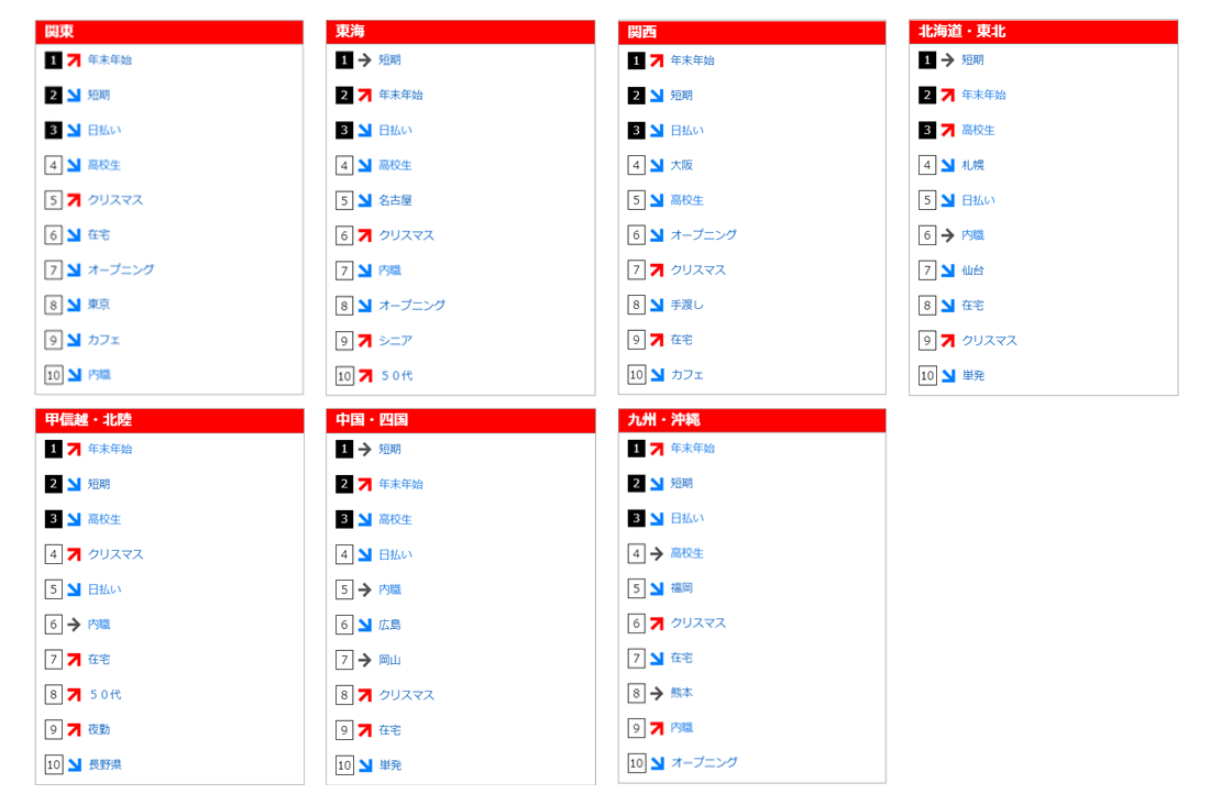 「関東」「関西」「甲信越・北陸」「九州・沖縄」の4エリアで「年末年始」が1位を獲得しました。先月に続き、「年末年始」「クリスマス」など季節に関するアルバイトを探すユーザーの動きがみられました。