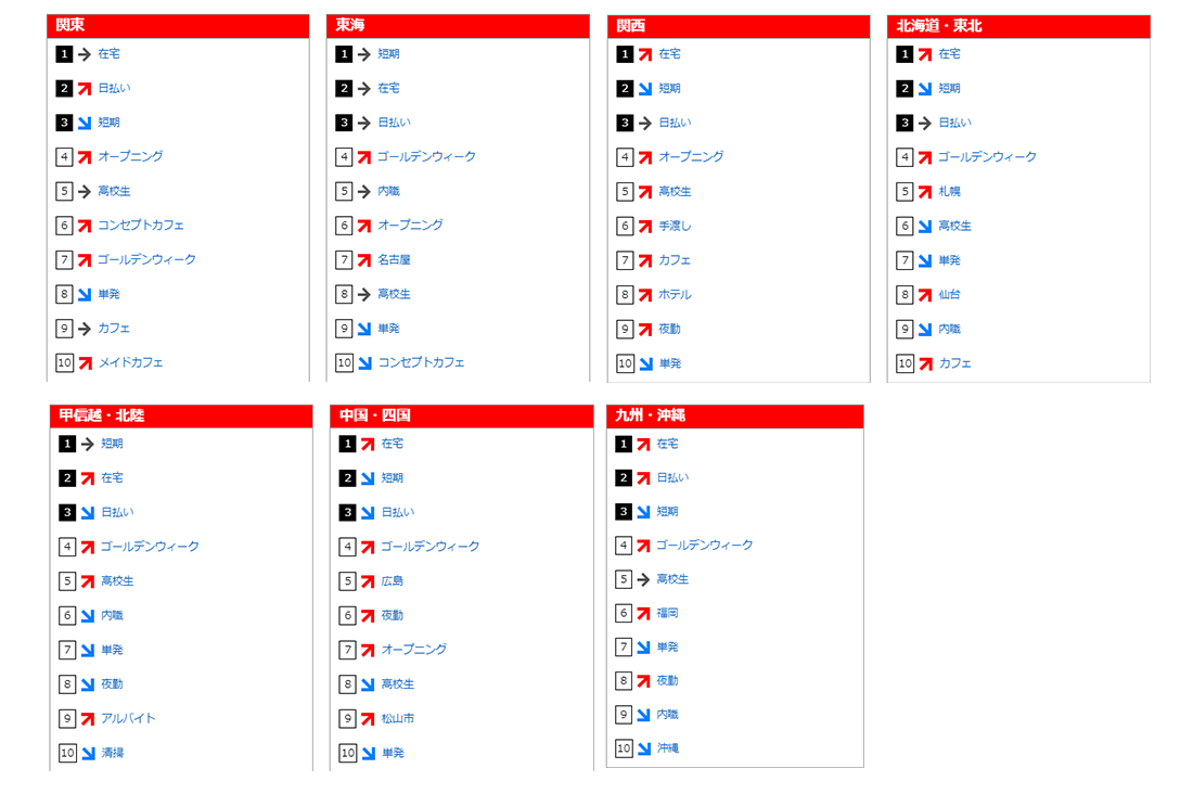 「短期」「在宅」「日払い」が全エリアで3位以内にランクイン