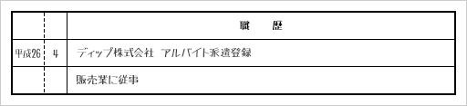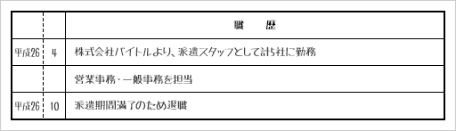 派遣社員としての職歴は、登録先の派遣会社を記載した上で、志望先の仕事内容に近いものを選んで書きます。すべて書く必要はありません。派遣先に対しては「入社」ではなく「就業」を使用します。