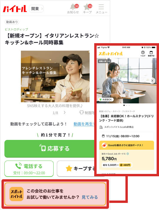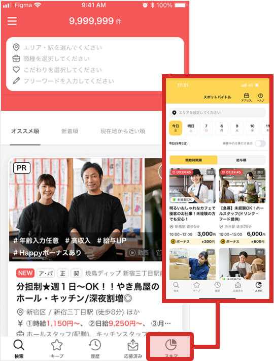 高い集客力を持つバイトルのサイト・アプリ内にスポットバイトルへの導線が増えます!